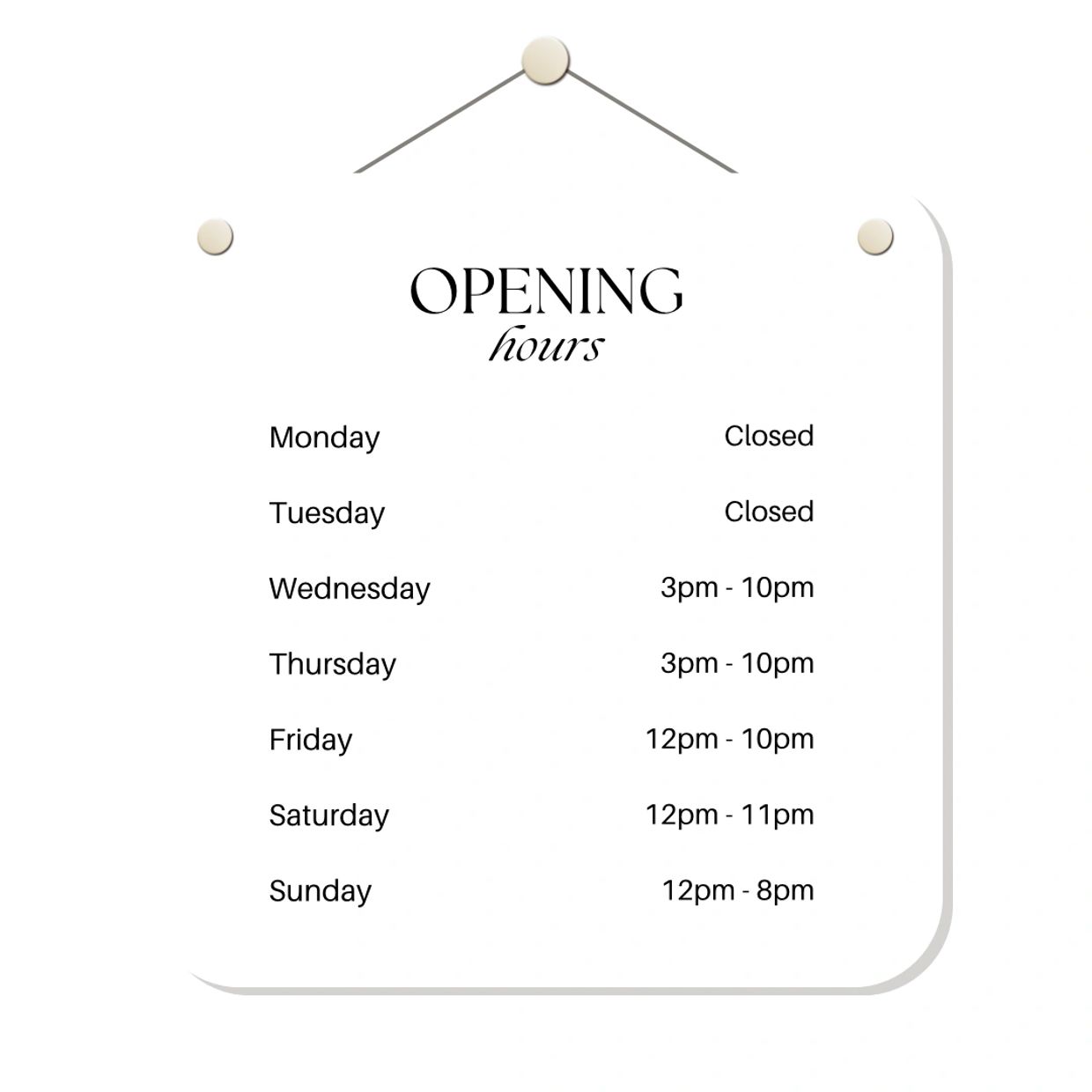 We are open Wednesday to Friday from 3pm to 10pm, and on Saturday from 12pm to 11pm - Sunday 12pm - 8pm